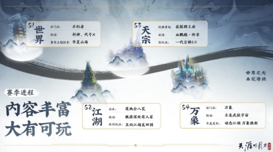 副本关卡则会保留天刀原本的风味,第一赛季玩家可前往「天涯镇」、「黄泉」、「天宫」、「大罗天」话本,更有怀旧话本待开放。