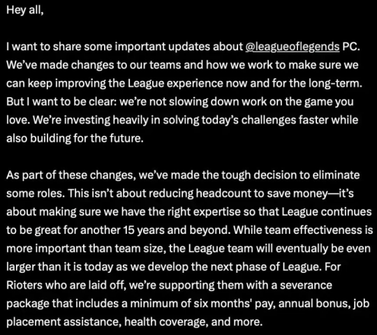 拳头游戏联合创始人、联合主席兼首席产品官Marc Merrill发文宣布公司将进行新一轮裁员。Tryndamere表示,这次裁员并非是为了省钱而减少员工数量,而是为了确保公司拥有合适的专业人才,以便《英雄联盟》在未来 15 年甚至更长的时间里继续保持辉煌。