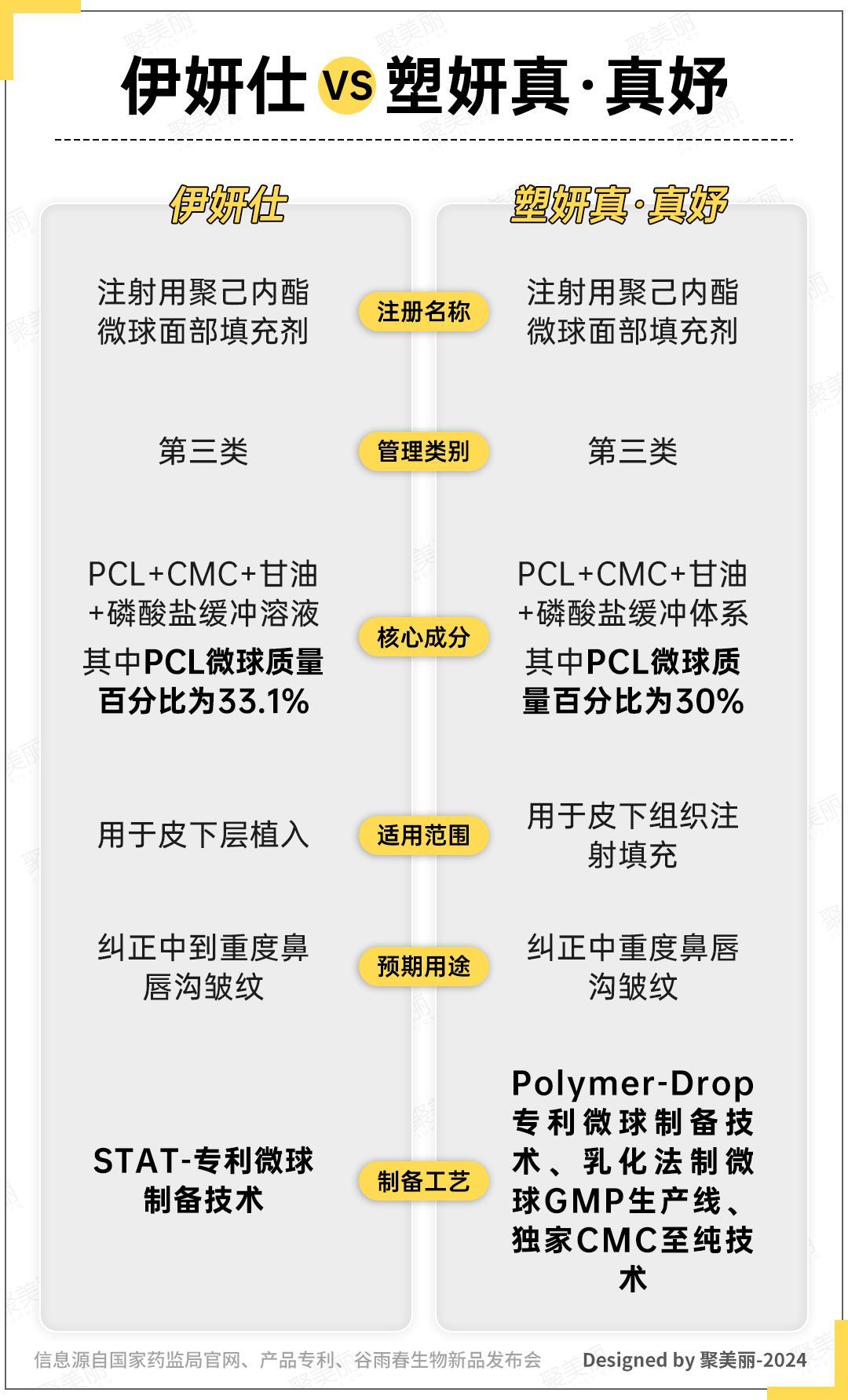 基于以上信息,某业内人士告诉聚美丽,“单从成分和原料来看,其实两款少女针产品很相似,均由PCL微球、甘油、CMC等构成,且均用于皮下组织注射填充,以纠正中重度鼻唇沟皱纹;区别在于,其核心成分PCL微球的浓度和大小不同,配方、纯化、专利等技术细节方面也存在差异。”