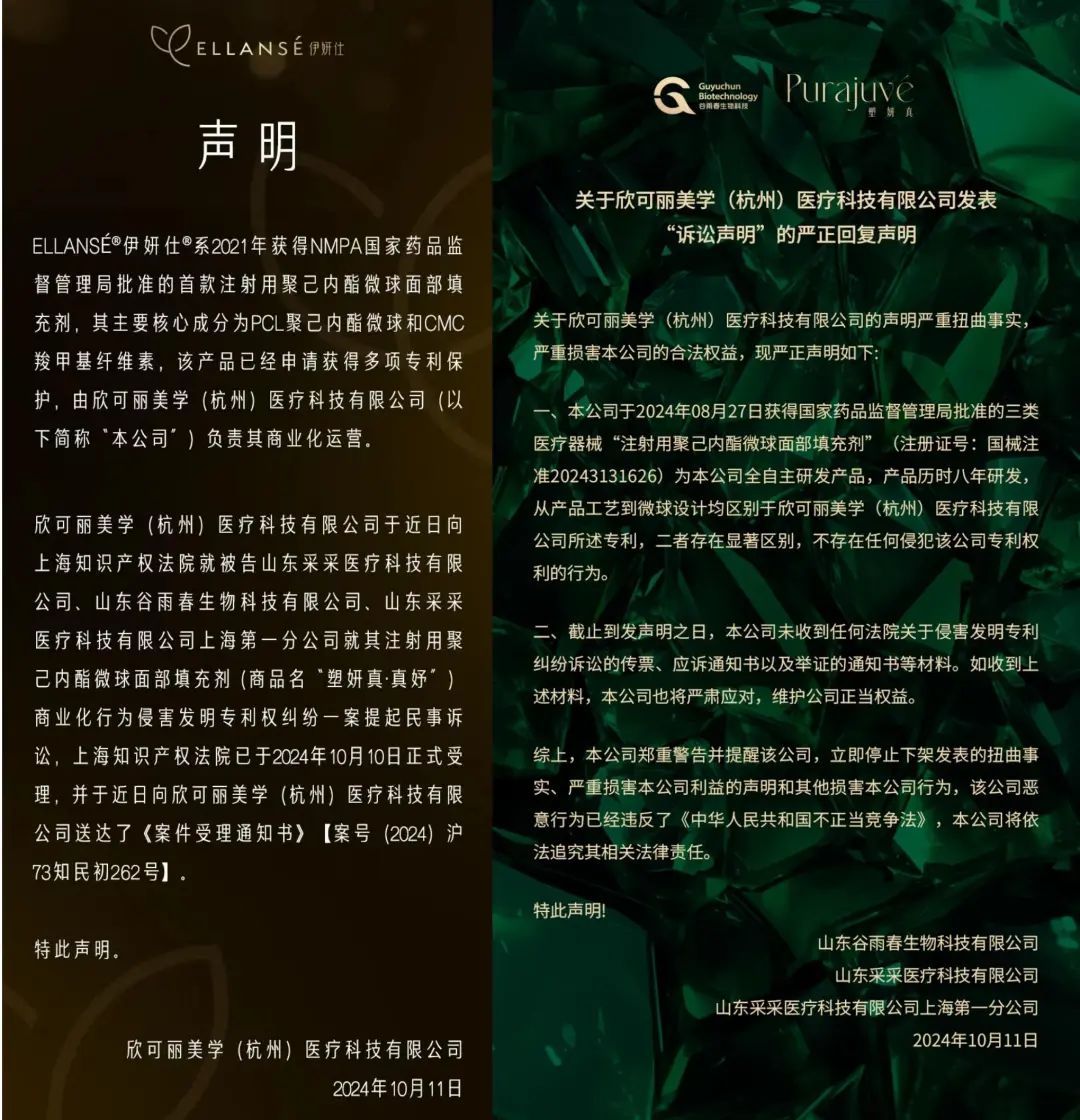 近日(10月11日),华东医药全资子公司Sinclair欣可丽美学(杭州)医疗科技有限公司(下文简称:欣可丽美学)旗下ELLANSE伊妍仕在其官方公众号发布声明,称山东谷雨春生物科技有限公司(下文简称:谷雨春生物)全资子公司山东采采医疗科技有限公司(下文简称:采采医疗)旗下产品塑妍真·真妤侵害其发明专利权,目前已提起民事诉讼。