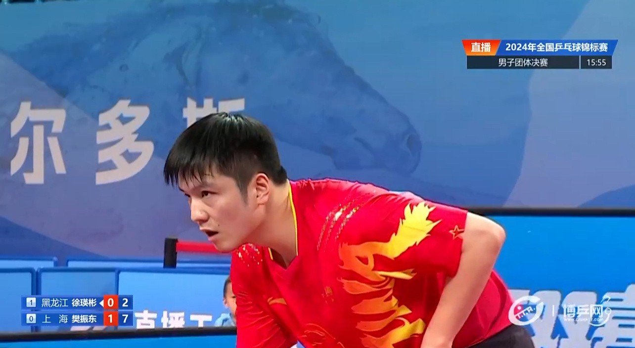 次盘,由上海队樊振东对阵黑龙江队徐瑛彬。首局,樊振东在就保持领先,之后徐瑛彬一路追分,上海队教练及时喊了暂停,最终樊振东以11-8拿下首局。第二局,樊振东以11-5迅速拿下。第三局,徐瑛彬3-6落后樊振东时,黑龙江教练叫了暂停。暂停之后,樊振东的发挥依旧出色,以11-7拿下第三局,为上海队扳回1分,大比分1-1战平黑龙江男团。