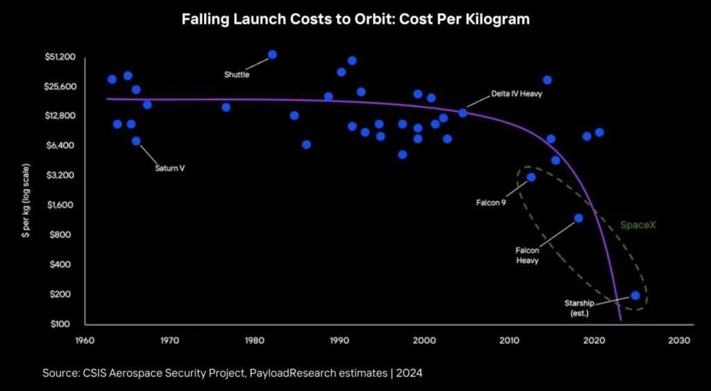 换句话说,如果科技创新能够实现太空发射成本的数量级下降,你就能够凭空创造一个以前根本不存在的市场出来,星链就是这样,在SpaceX成立的时候,它甚至都还没成为一个想法。