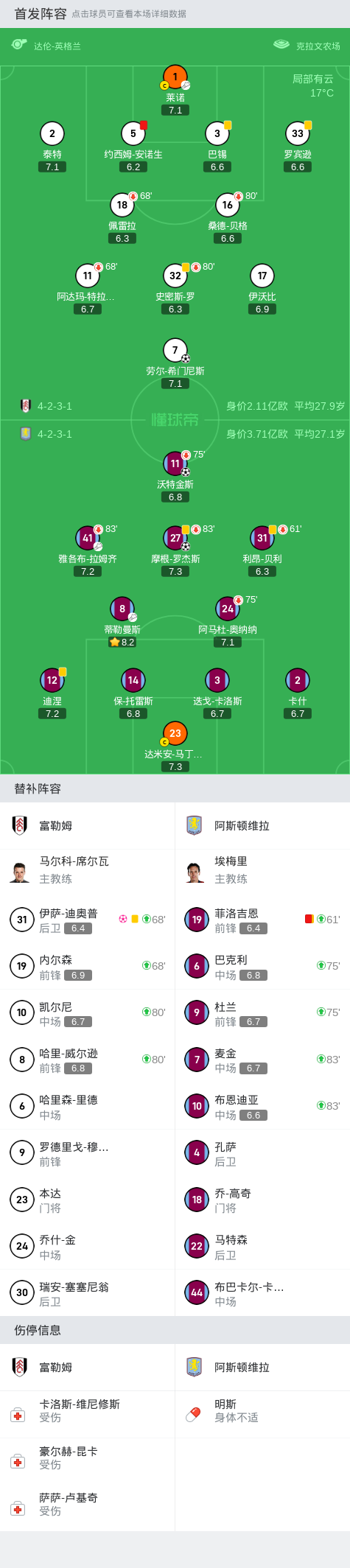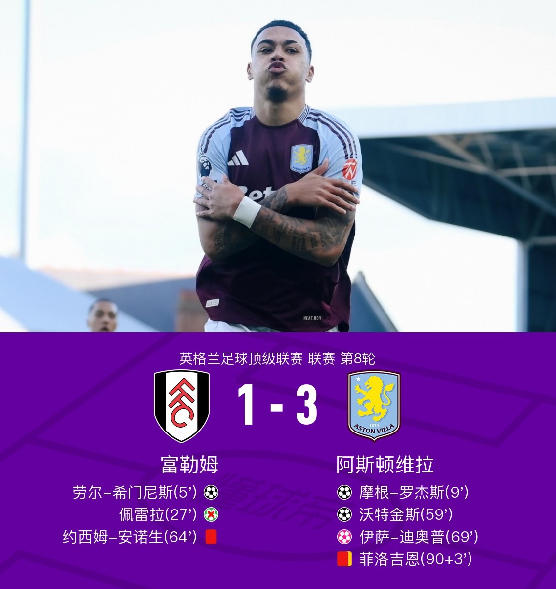 在英格兰足球顶级联赛第8轮的较量中,富勒姆坐镇主场迎战阿斯顿维拉。上半场,莱诺助攻劳尔-希门尼斯破门;摩根-罗杰斯弧顶射门将比分扳平。佩雷拉主罚点球被马丁内斯牢牢抱住。下半场,蒂勒曼斯角球助攻沃特金斯破门将比分反超。约西姆-安诺生回访犯规被直红牌罚下;伊萨-迪奥普不慎送乌龙;菲洛吉恩两黄变一红被罚下。最终阿斯顿维拉客场3-1逆转富勒姆。