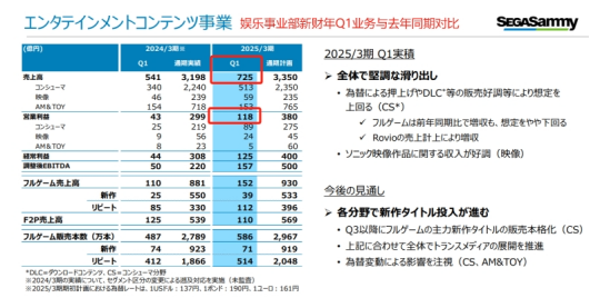新财年的第一季度内,世嘉整体收入达到1082亿日元,娱乐内容相关业务领域贡献收入725亿日元,同比增长34%;该部门的利润则为118亿日元,同比增长174%。
