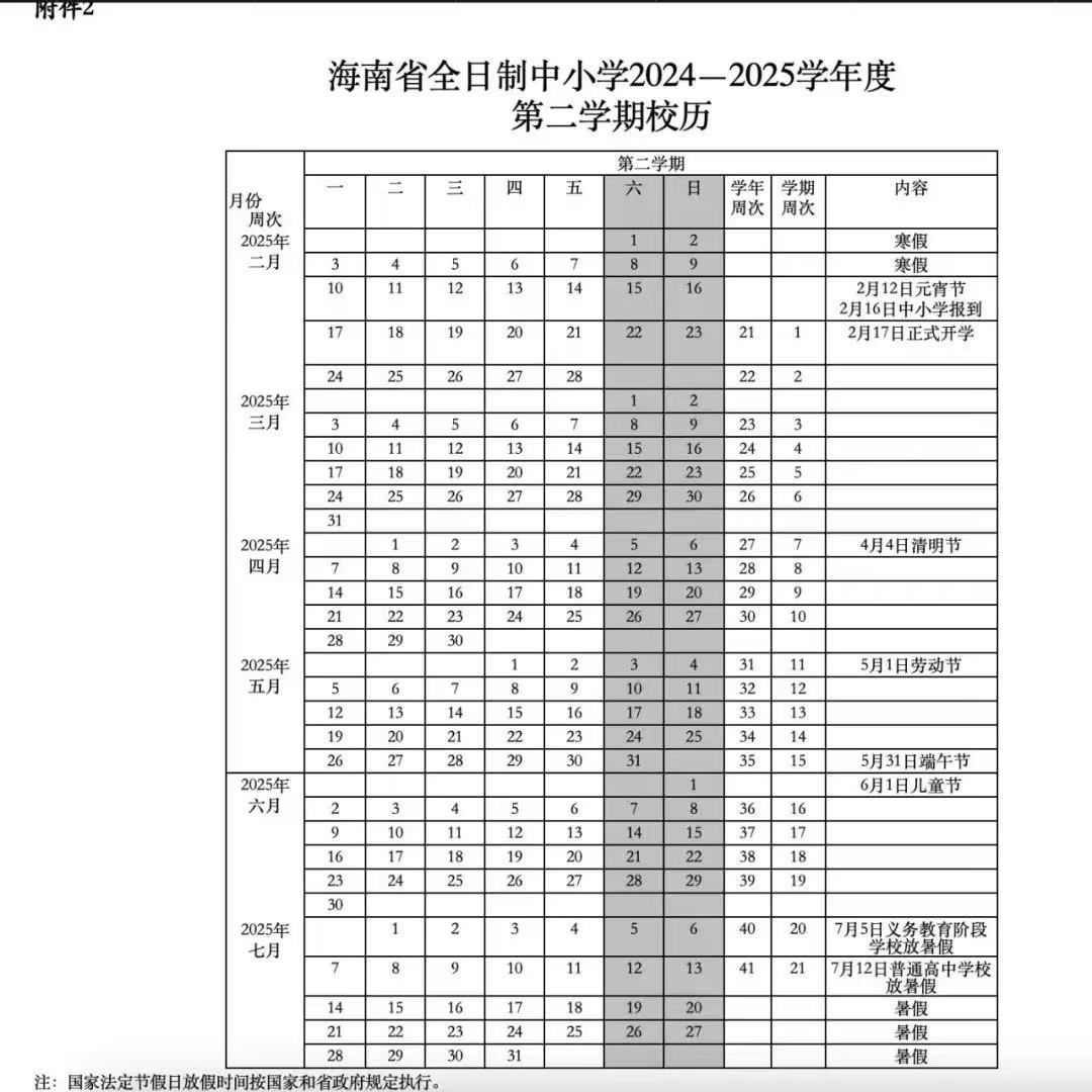 2024-2025学年第二学期,中小学开学时间为2025年2月17日,小学、初中暑假放假时间为2025年7月5日,暑假放假时间为2025年7月12日。