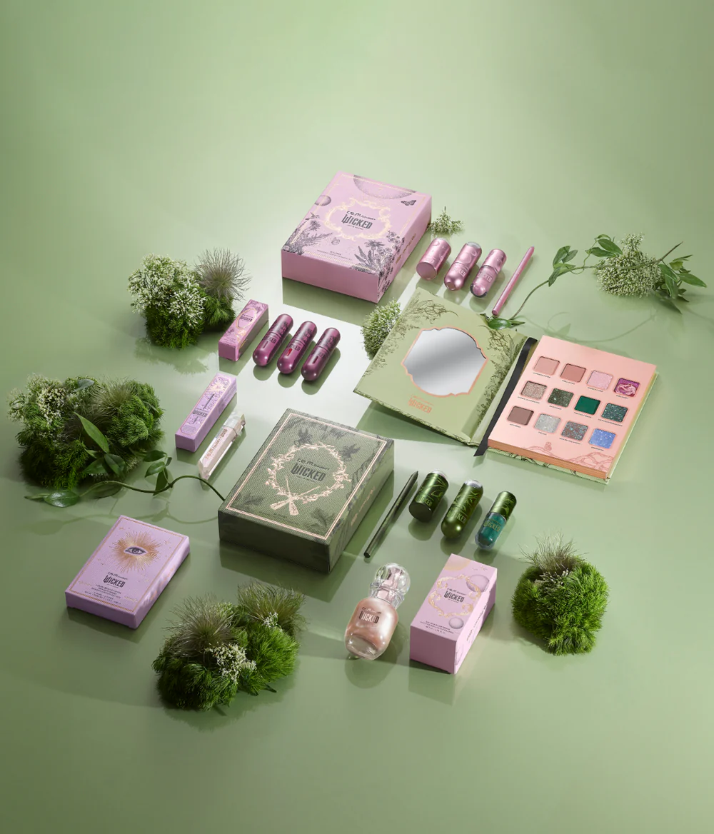 据悉,新系列以电影中的主题、场景为基础,推出了眼影、腮红、口红、眼线笔、液体眼影、唇彩等限定单品,同时以Glinda和Elphaba两个主角为灵感,还推出了两个适配人物角色的彩妆套装。