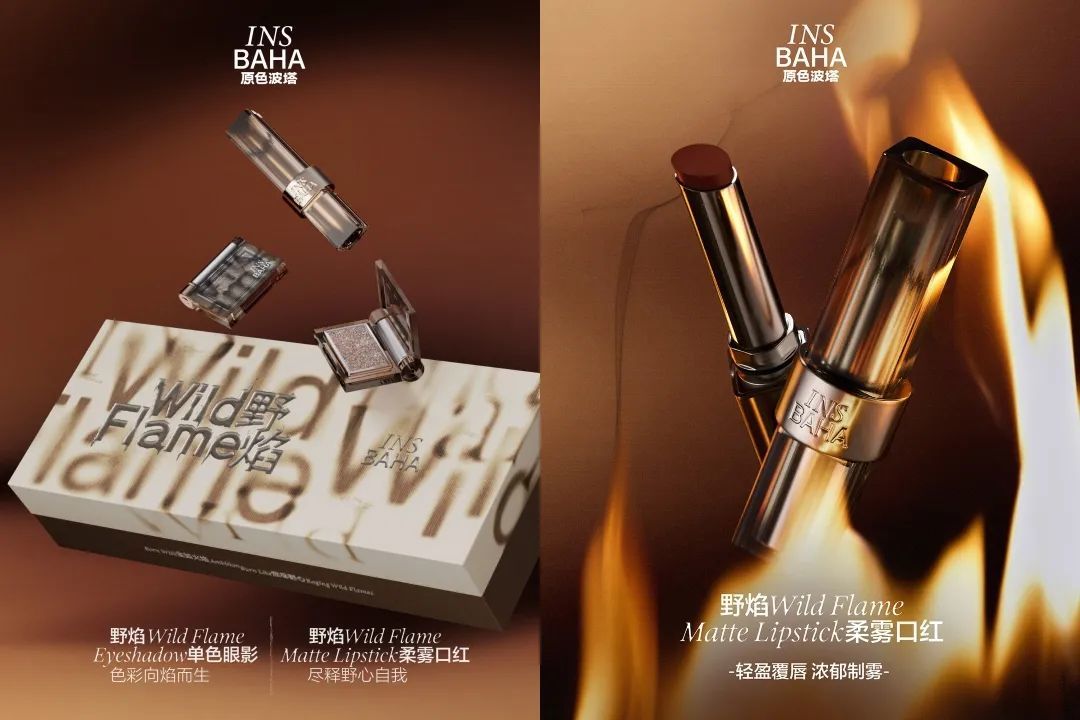 彩妆品牌INSBAHA原色波塔推出了全新野焰系列,包括6个色号的野焰柔雾口红和9个色号的野焰单色眼影。