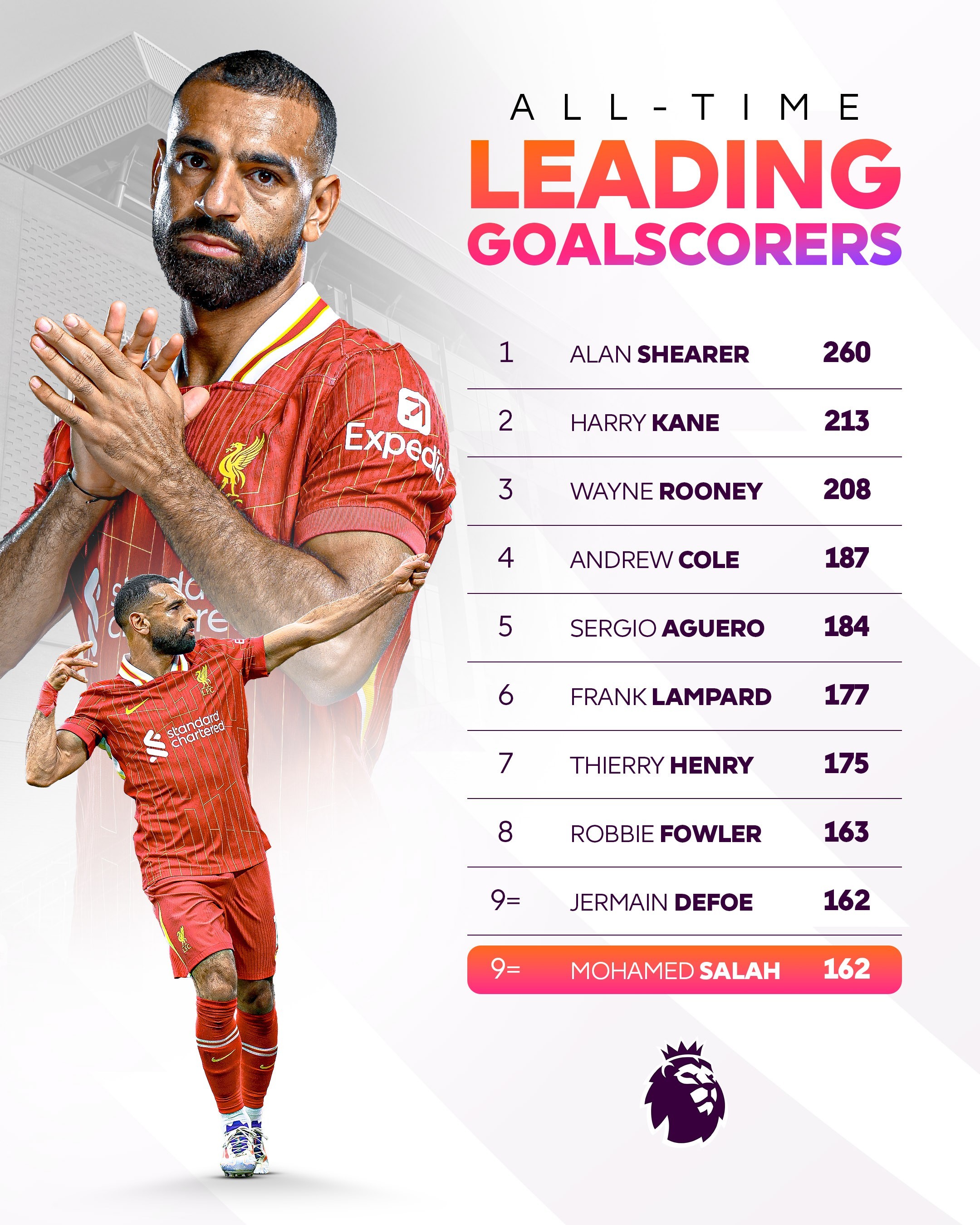 这个点球成为了萨拉赫职业生涯中在英超联赛取得的第162个进球,这使得他的进球数已经追平了英超名将迪福,现在他们并列排在英超联赛历史射手榜的第九位。