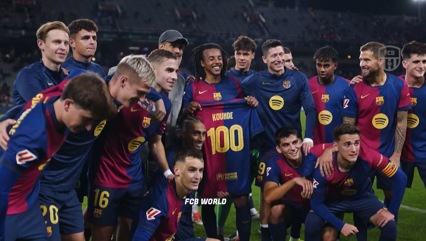 在跟随巴塞罗那主场5-1大胜塞维利亚后,孔德在赛后获得了巴萨百场纪念球衣,并与全队合影庆祝了这一纪念意义的时刻。