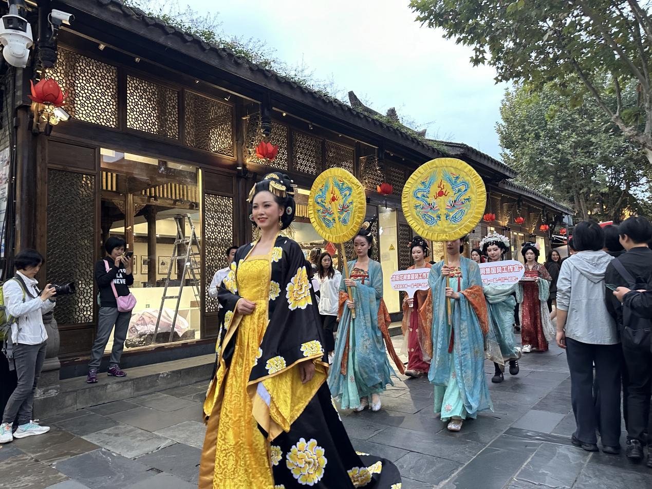 在成都网红打卡地——宽窄巷子,武皇巡游、唐风歌舞、汉服cosplay真人秀轮番上演,精彩的表演赢得了阵阵掌声和欢呼。
