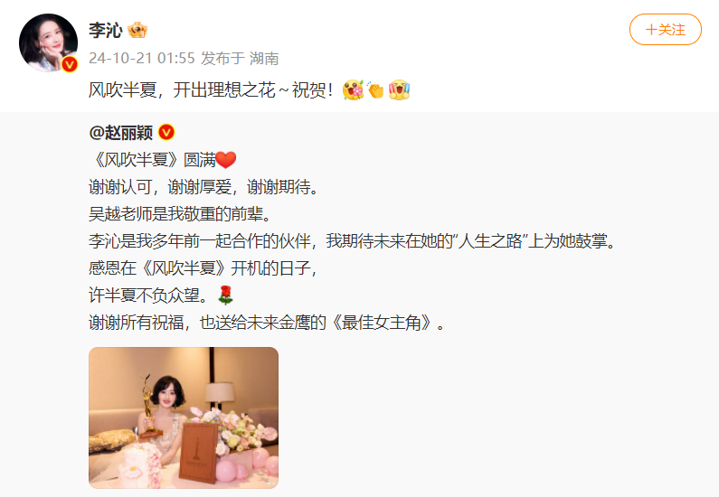 被赵丽颖“cue到”的李沁也在第一时间转发赵丽颖的微博并发文祝贺:风吹半夏,开出理想之花~祝贺!