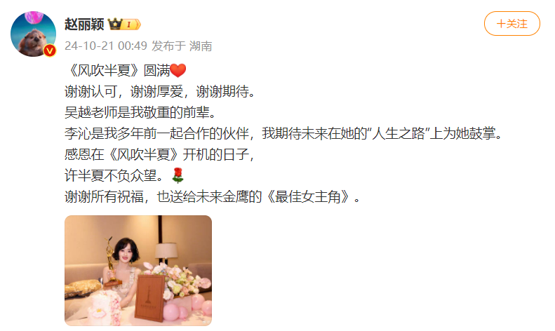 获奖后,赵丽颖深夜在个人社交账号晒出捧杯照纪念二封金鹰“视后”,并特别提及获得提名的吴越和李沁:《风吹半夏》圆满,谢谢认可,谢谢厚爱,谢谢期待。吴越老师是我敬重的前辈。李沁是我多年前一起合作的伙伴,我期待未来在她的“人生之路”上为她鼓掌。感恩在《风吹半夏》开机的日子,许半夏不负众望。谢谢所有祝福,也送给未来金鹰的《最佳女主角》。