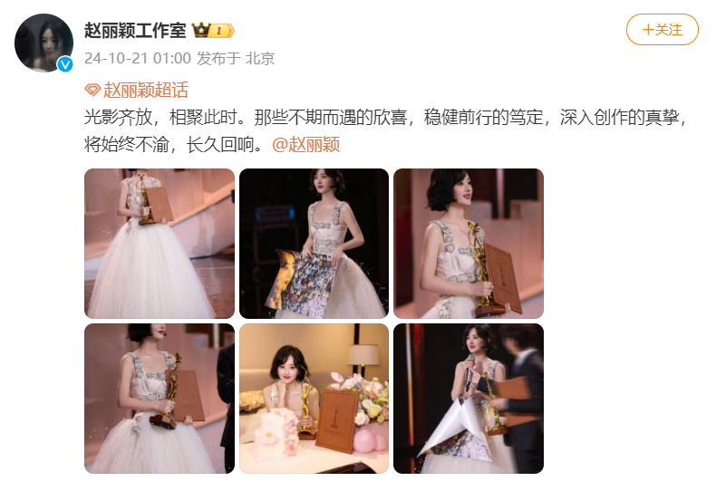 工作室随后晒出多张赵丽颖获奖后的美照,并配文:光影齐放,相聚此时。那些不期而遇的欣喜,稳健前行的笃定,深入创作的真挚,将始终不渝,长久回响。
