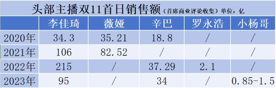 首先我们来看一下李佳琦双11销售额的首日对比。2021年双十一预售首日为106亿元;到了2022年,这一数字更是暴增至215亿元。到了2023年,销售额有所下滑至95亿元,与前两年相比有所回落。但他是为数不多一直在线的头部主播。