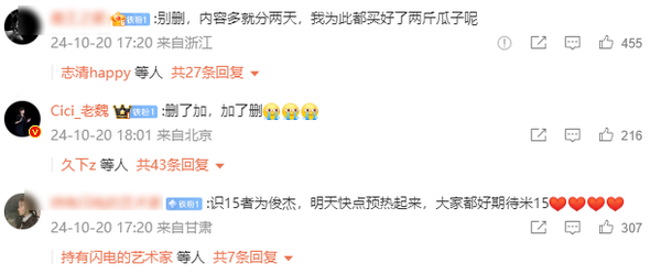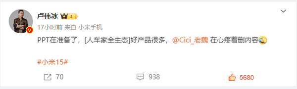 日前,小米集团合伙人、总裁卢伟冰发文透露,小米新品发布会的PPT在准备了,“人车家全生态”好产品很多,“Cici_老魏”在心疼着删内容。对此,有网友调侃道:“别删,内容多就分两天发布,我都特意买了两斤瓜子呢。”还有网友催促道:“识15者为俊杰,赶紧预热起来。”