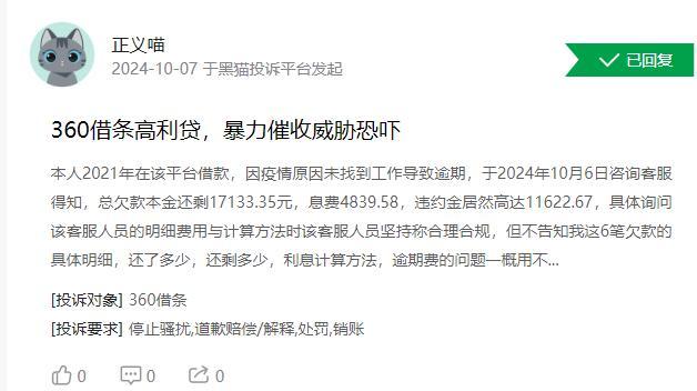 但黑猫投诉平台上关于360借条的投诉已高达3.7万+,且有用户投诉称,在360借条上剩余欠款本金为17133.35元,需同时偿还4839.58元的息费和11622.67元的高额罚息。