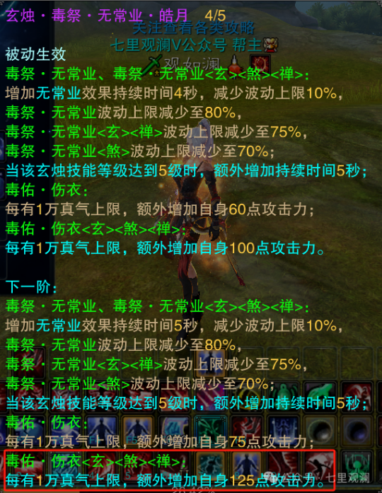 第三是四代技能,皓月品质5级,每1万真气125点攻击