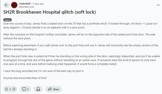 在 reddit “寂静岭板块” 中,用户 “dissonant_one” 发布的一篇帖子显示,该玩家在布鲁克海文医院的三楼发现了一扇带有舷窗的密封门,门旁有一个保存点。当玩家触发医院屋顶上的过场动画后,主角詹姆斯会位于密封舷窗门的另一侧,即没有保存点的那一侧。但如果在探索其他地方之前,玩家操作詹姆斯走到舷窗并进行触发,就会出现他所在大厅的错误的空版本,进而导致游戏卡关无法继续。
