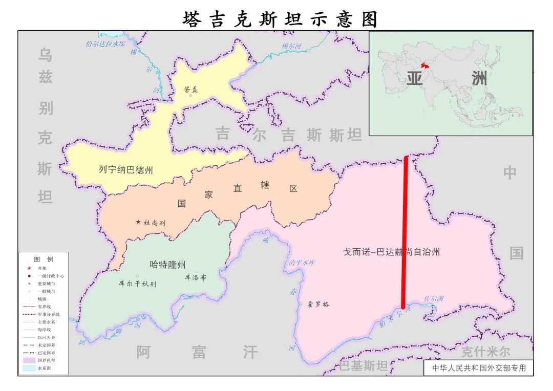 根据《中国地图制图规范》,“未定国界”需要使用虚线表示,目前仅有中塔边境如此表示。