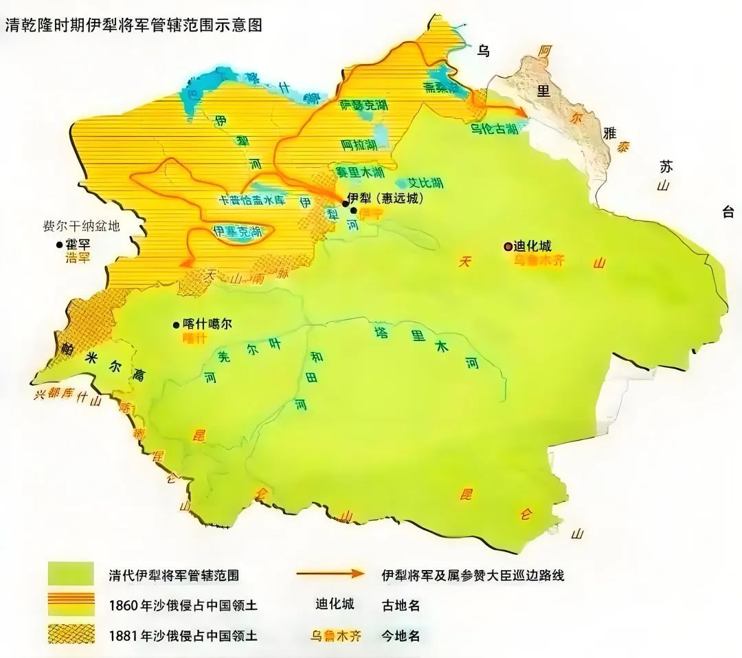 ▲清乾隆时期伊犁将军府管辖范围