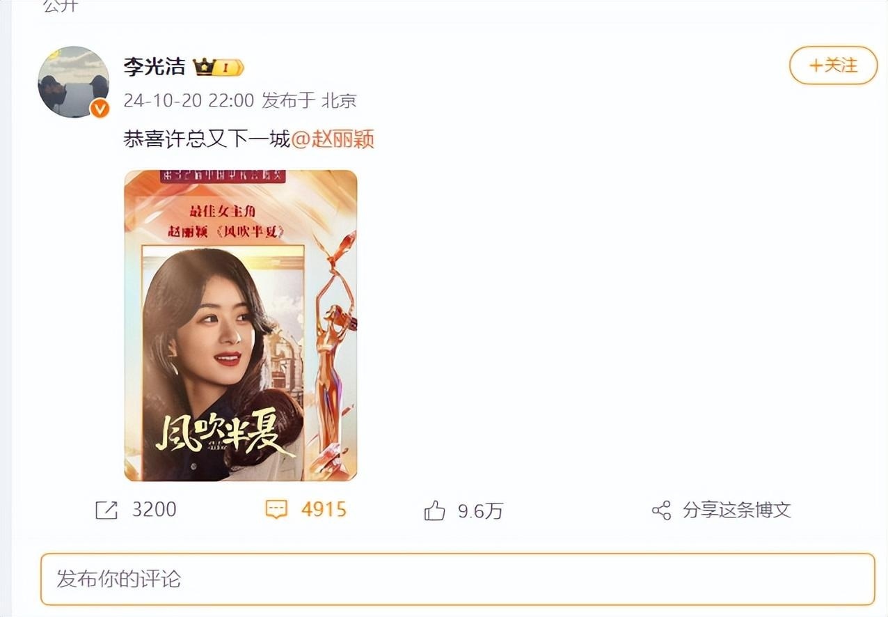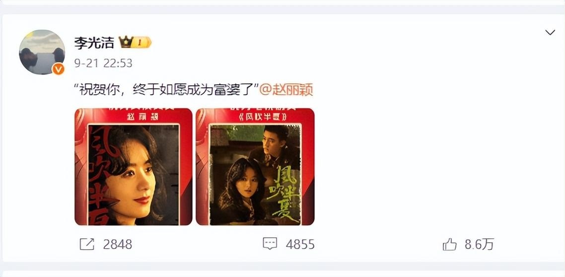 9月22日,赵丽颖获得第34届电视剧“飞天奖”优秀女演员奖,《风吹半夏》获飞天奖优秀电视剧奖。李光洁就发文喊话赵丽颖:“祝贺你,终于如愿成为富婆了。”