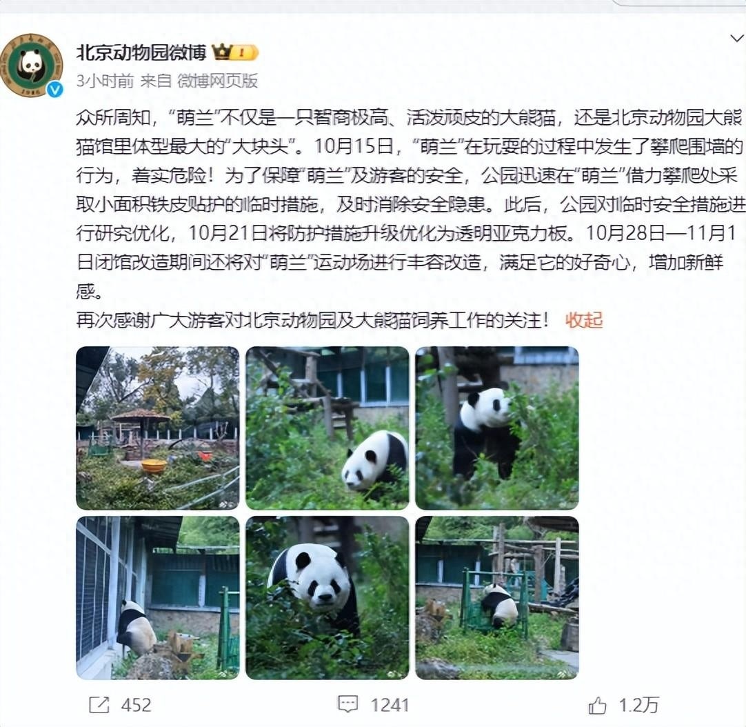 10月28日—11月1日闭馆改造期间还将对“萌兰”运动场进行丰容改造,满足它的好奇心,增加新鲜感。再次感谢广大游客对北京动物园及大熊猫饲养工作的关注!