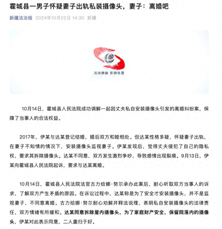10月14日,霍城县人民法院成功调解一起因丈夫私自安装摄像头引发的离婚纠纷案,保障了当事人的合法权益。