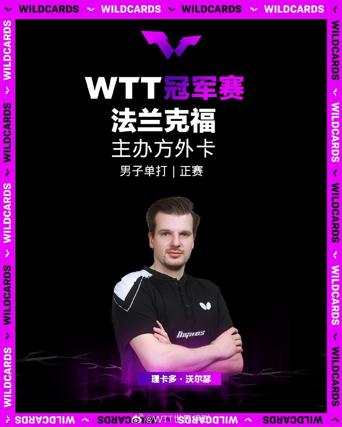 2024WTT法兰克福冠军赛公布了外卡选手,两位本土选手入选,男单外卡选手为来自德国的理卡多-沃尔瑟,女单外卡选手为来自德国的安妮特-考夫蔓。