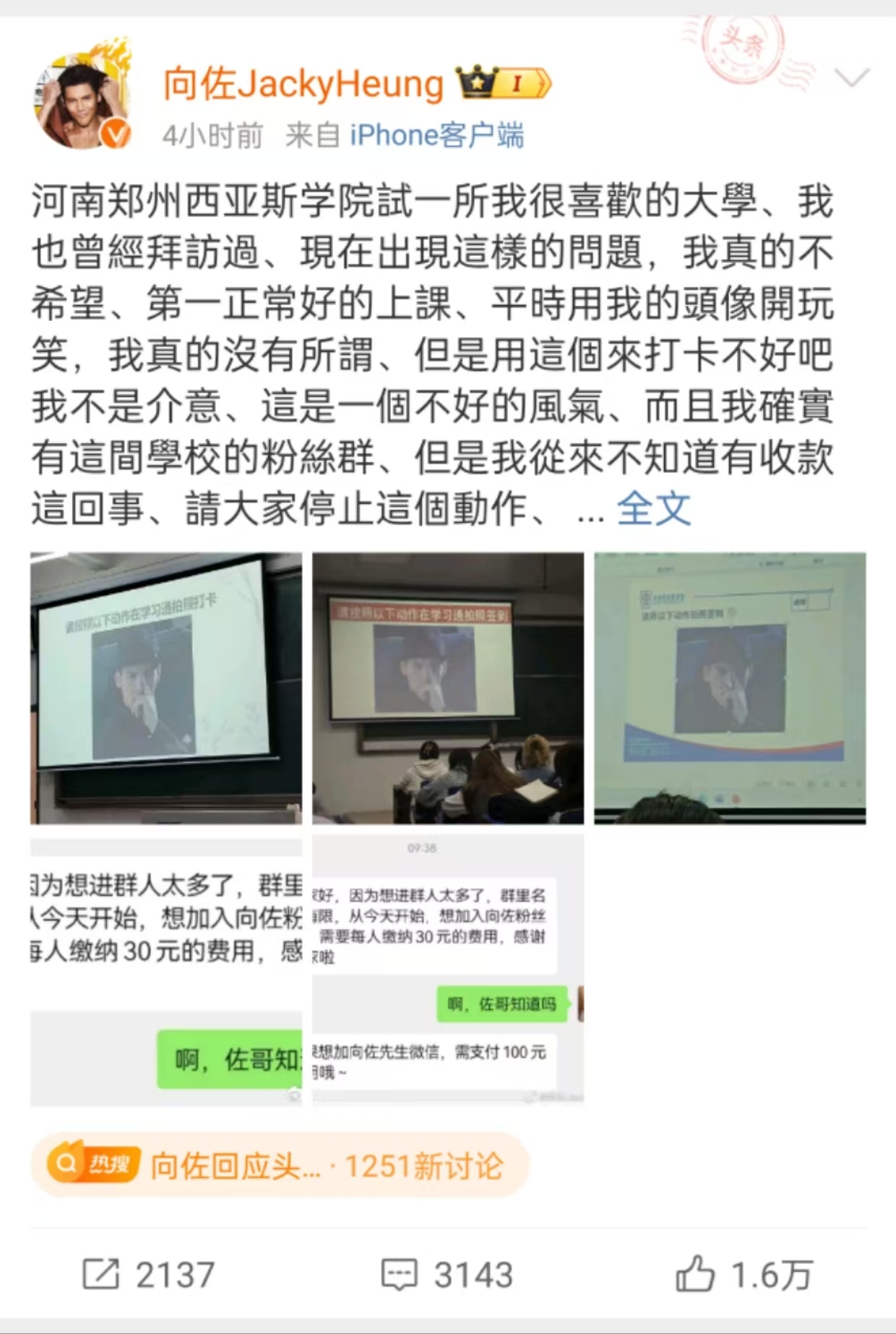 22日,向佐发文称:“这是一个不好的风气,希望大家正常上课,继续正常的风气上课”。“平时用我的头像开玩笑,我真的没有所谓,但是用这个来打卡不好吧。”其称。