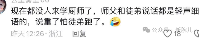 「现在都没人来学厨师了,师傅和徒弟说话都轻声细语的,说重了怕徒弟跑了。」