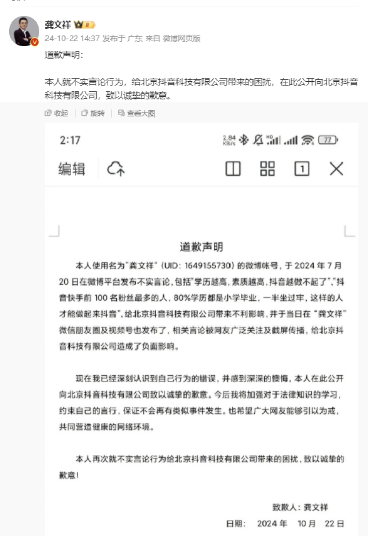 在道歉声明中,龚文祥坦诚地承认了自己在2024年7月犯下的错误。他在微博上发布了一系列贬低抖音用户学历和素质的言论,如“学历越高,素质越高,抖音越做不起了”、“抖快手前100名粉丝最多的人,80%学历都是小学毕业,一半坐过牢,这样的人才能做起来抖音”。这些言论不仅缺乏事实依据,还误导了公众对抖音用户的认知,给北京抖音科技有限公司带来了极大的负面影响。