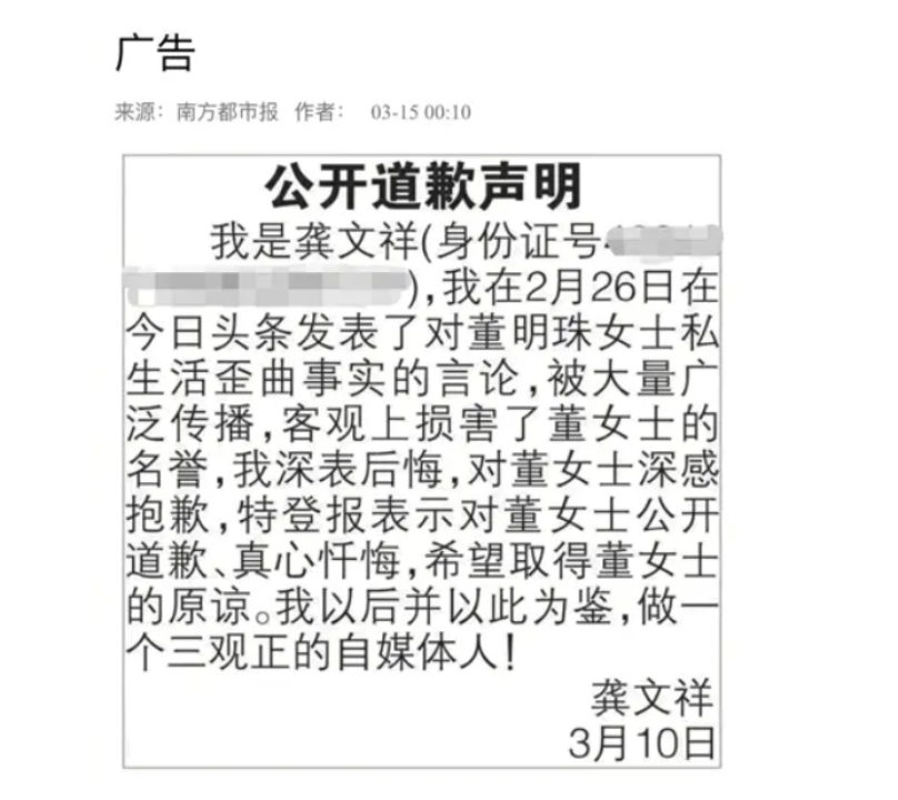 2023年3月15日,龚文祥在南方都市报上发布了一则道歉声明,正式向格力电器董事长兼总裁董明珠道歉。