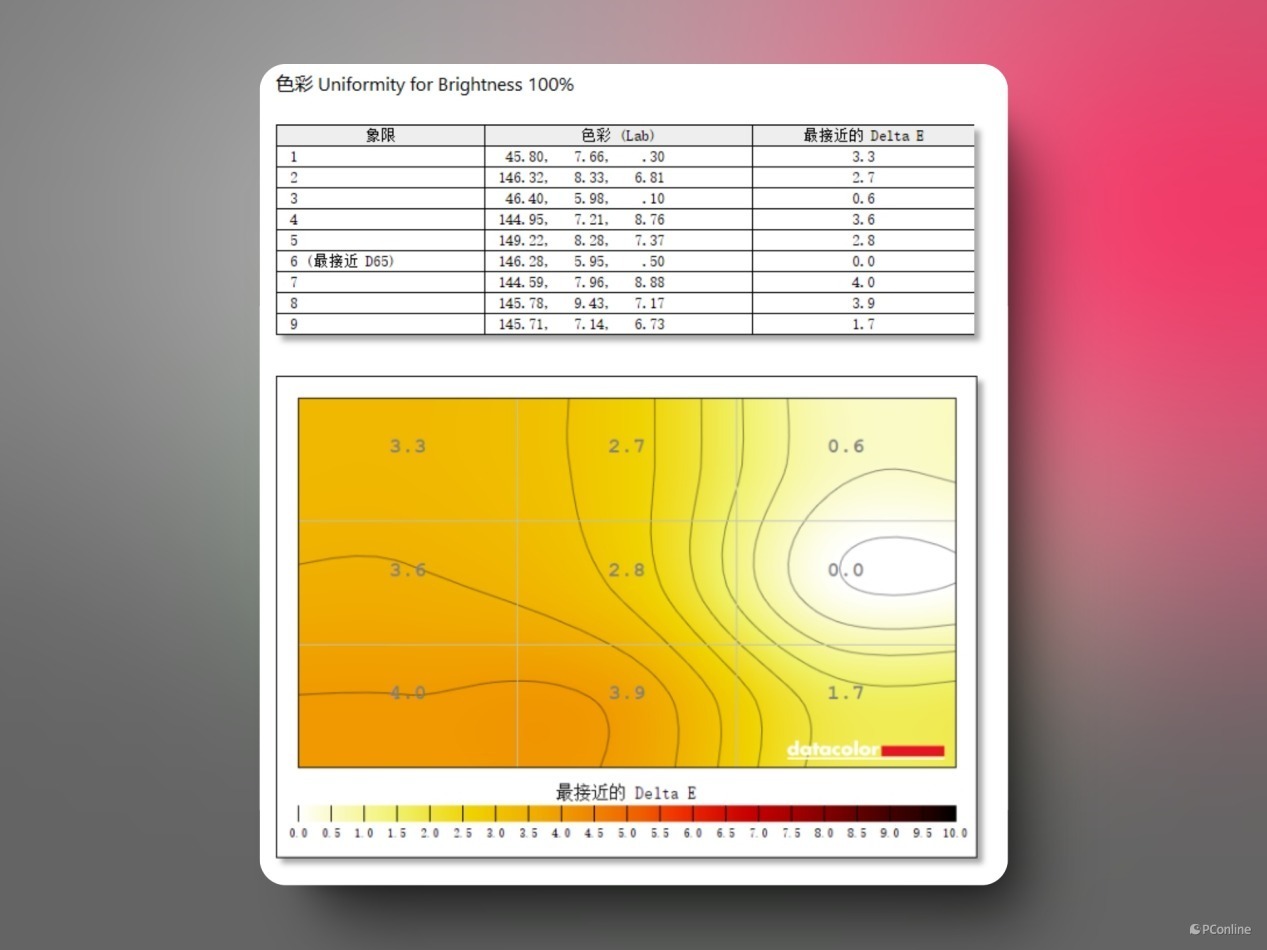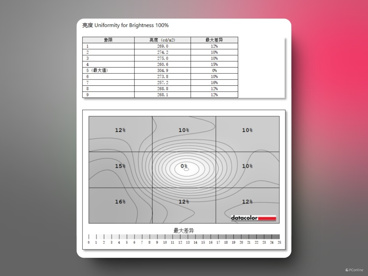 在屏幕均匀性测试中,我们发现当亮度设置为 100% 时,屏幕的最大色彩偏差值为 Delta E 4.0,出现在左下角区域。与此同时,最大亮度均匀性差值为 16%,屏幕四周的亮度差异均在 10% 以上。虽然这样的均匀性表现并不算顶尖,但对于绝大多数使用场景来说,其影响并不明显,尤其是在游戏中,肉眼几乎难以察觉。