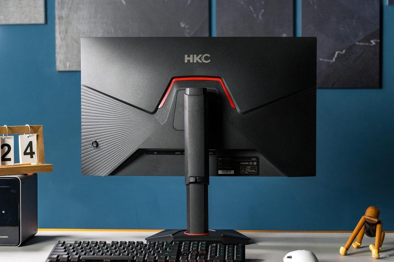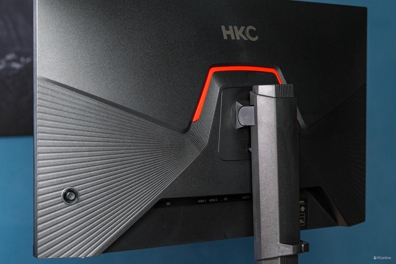 背面设计更是亮点十足,“猎鹰展翅”纹路与电竞红线条交相辉映,瞬间拉满氛围感,电竞味儿直接拉满。背部中央的白色HKC品牌Logo形成了明显的视觉对比,让整机辨识度更高。