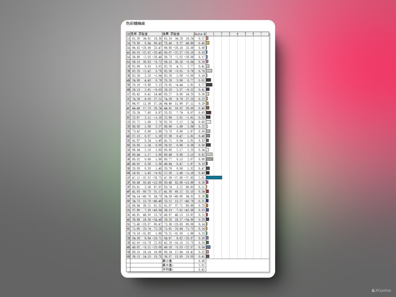 最后,在色彩准确度方面,HKC G27H7 Pro 取得了相当令人惊艳的成绩,实测的平均 Delta E 为 0.41。Delta E 是用来衡量显示器色彩准确度的数值,数值越低,色彩越接近真实表现。通常来说,Delta E 小于 1 就已经接近专业级别的显示器表现,而 G27H7 Pro 在默认状态下就能达到这一水准,甚至与一些专业级显示器不相上下。如此优秀的色彩准确度不仅提升了游戏中的视觉体验,还使得这款显示器能够胜任一定的专业设计、视频剪辑等工作。