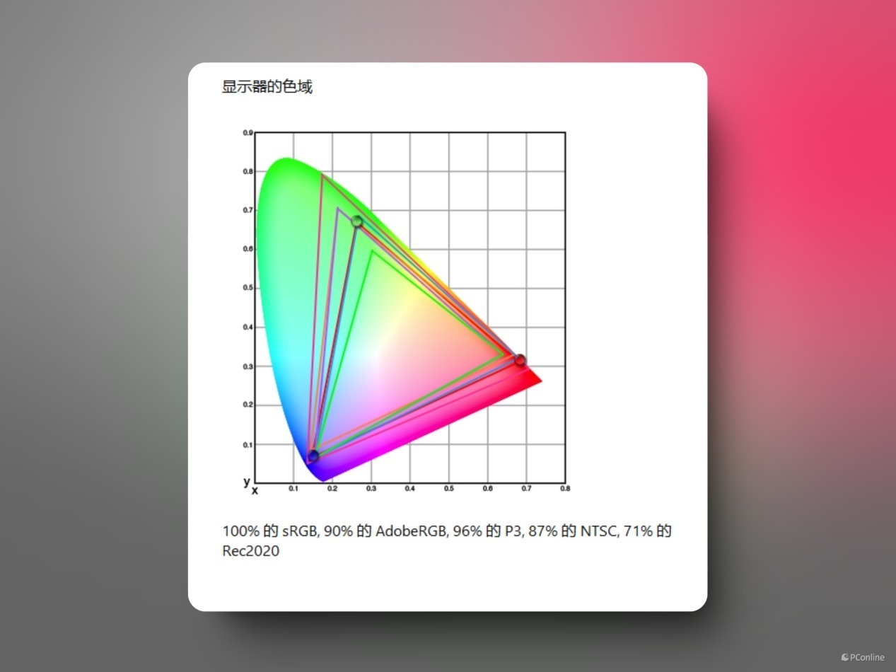 而 DCI-P3 色域则广泛应用于电影与视频制作,高达 96% 的覆盖率意味着这款显示器不仅在游戏中表现出色,还符合一些对色彩准确度要求较高的工作,如视频剪辑和图像后期处理。对于 Mac 用户,96% 的 P3 色域覆盖也能良好兼容苹果设备的色彩生态,带来更一致的视觉体验。