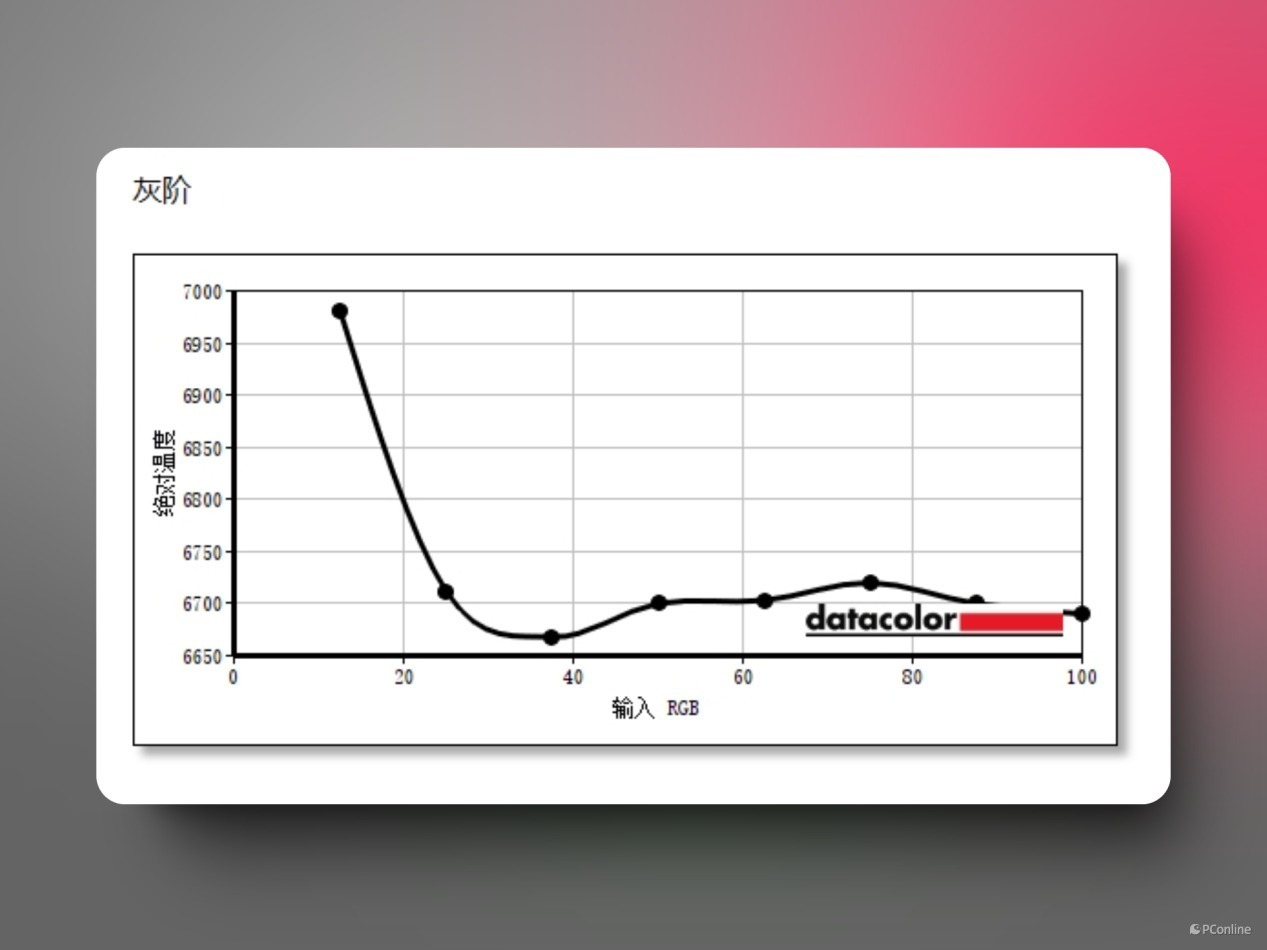 灰阶测试则显示,HKC G27H7 Pro 的色温在 7550K 左右,略高于标准的 6500K。较高的色温会使屏幕显得稍微偏冷,呈现出蓝调色彩。虽然这样的偏冷色调在游戏中可能并不会对视觉体验造成太大影响,但对于长时间使用的用户而言,建议开启暖色模式,使色温稳定在 6700K 左右。这不仅更加接近 D65 标准,也能在实际使用中减轻眼部疲劳。