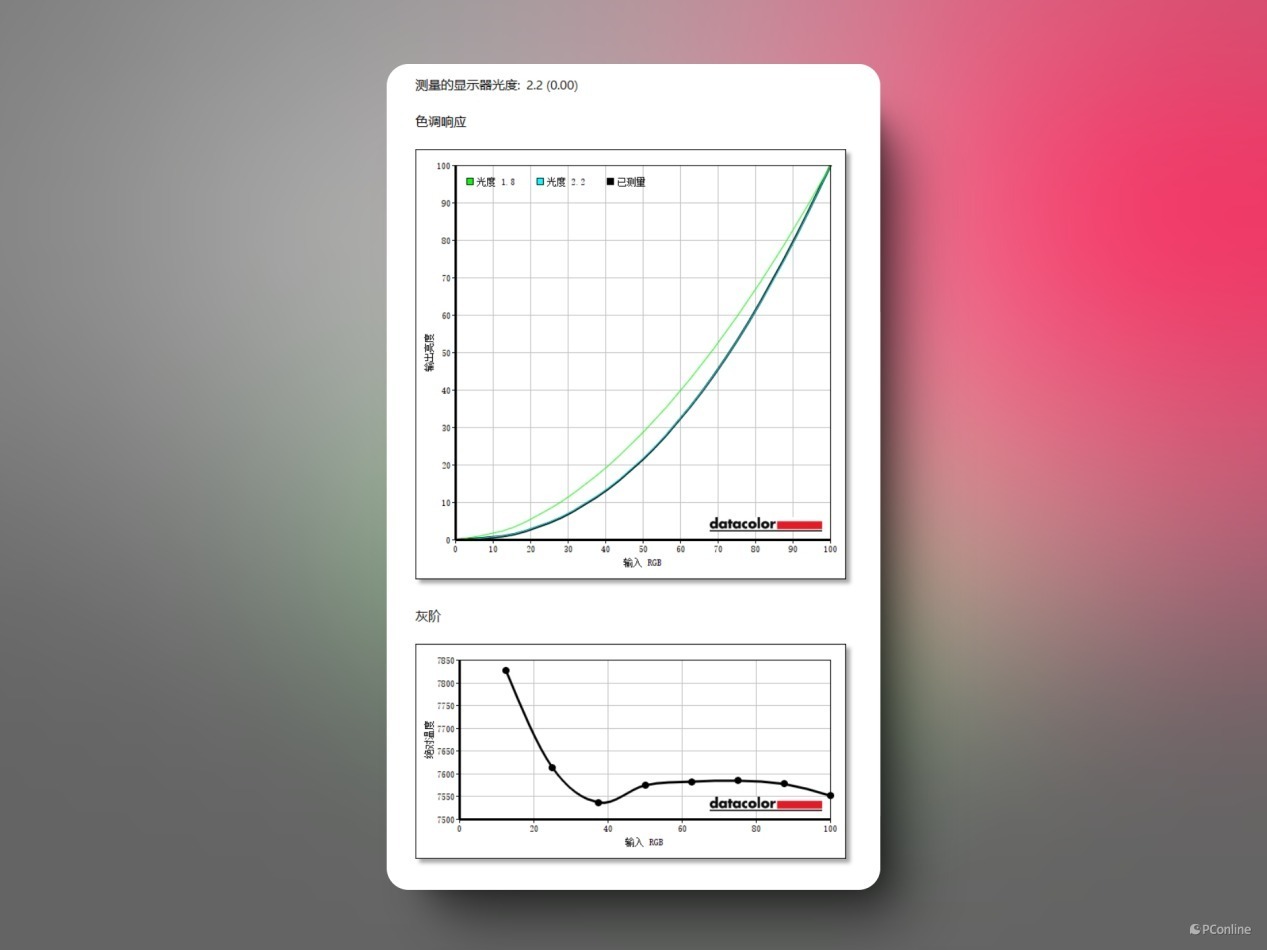 在色调伽马曲线测试中,HKC G27H7 Pro 的表现与标准的 Gamma 2.2 曲线高度吻合。伽马曲线是显示器亮度与输入信号之间的关系曲线,理想的伽马值能够确保画面的亮度与对比度均衡,保证图像的真实再现。该显示器的伽马表现意味着它可以在明暗部分保持良好的细节还原,避免画面过曝或过暗。