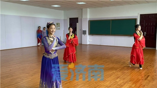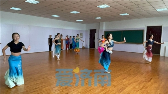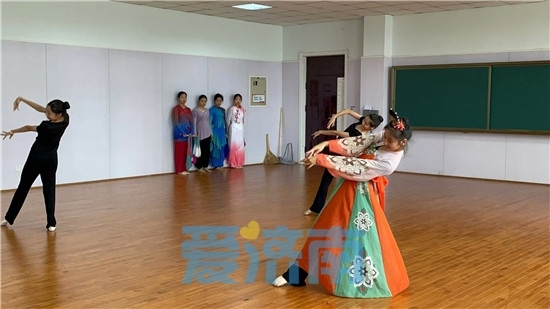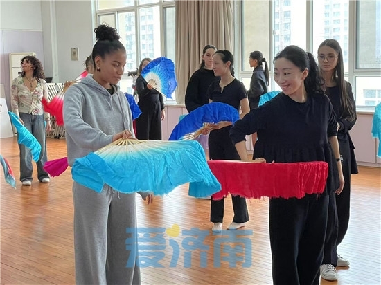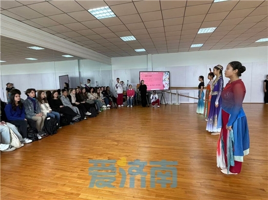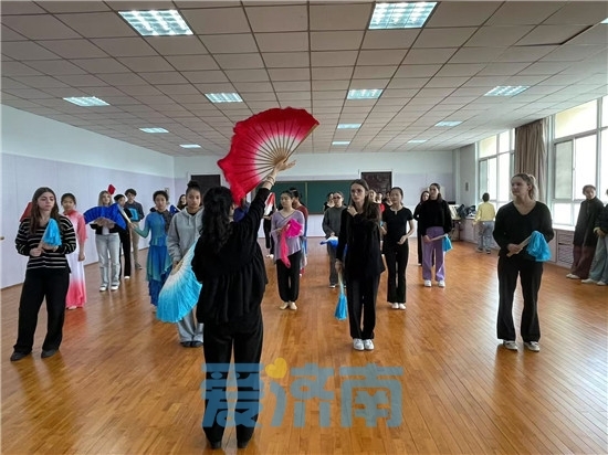 在济南二中舞蹈教室,等候在此的二中学子身着色彩鲜明的中国传统舞蹈服装,为法国客人简单介绍舞蹈种类和文化背景后,奉上了精彩的民族舞表演串烧,法国师生不禁纷纷拿出手机拍摄。
