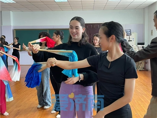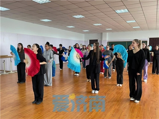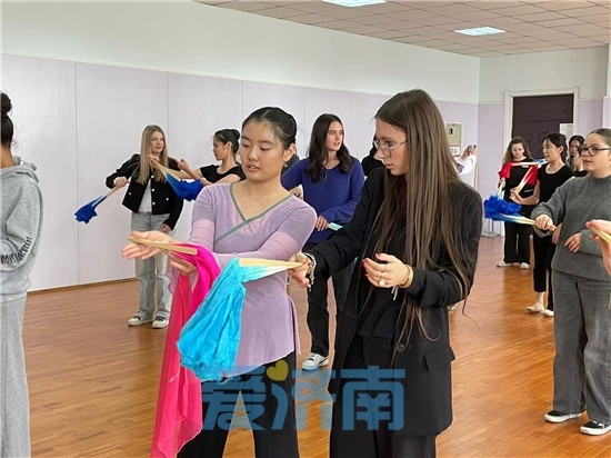 观看了优美舞蹈的法国高中生跃跃欲试,纷纷更换“行头”,迫不及待要体验一把中国舞。济南二中音乐教师李晓滨指导中法学生学习扇子舞的基本动作,二中学子耐心热情地手把手指导法国客人,氛围其乐融融,舞蹈教室里时不时传来笑声。
