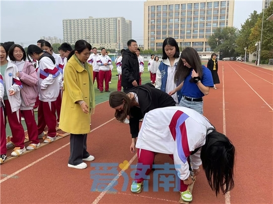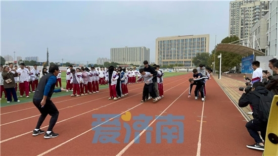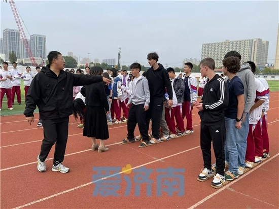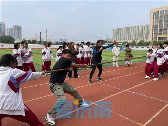 另一边,学校操场上,欢呼声、呐喊声此起彼伏,原来,中法师生正开展激烈热闹的传统游戏大比拼。旱地龙舟、拔河等游戏,让高中生们玩得不亦乐乎,济南二中校长何仲明也在现场为学生指导。