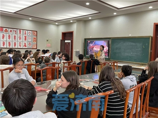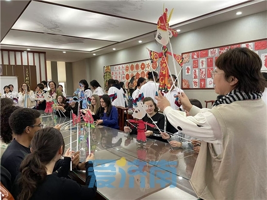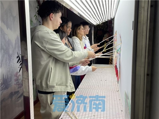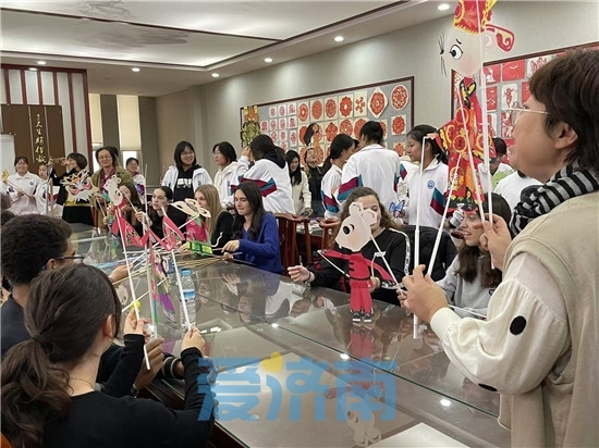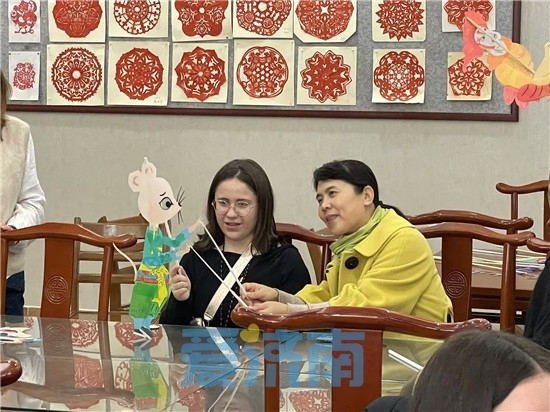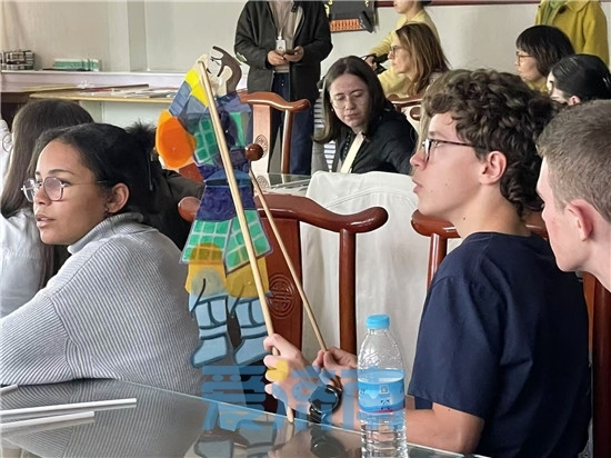 随后,法国师生来到书画教室,桌上早已摆好的皮影材料立马吸引了他们的目光,皮影戏是济南二中的特色活动,美术教师郭严为大家讲解了皮影的基本原理和组成。
