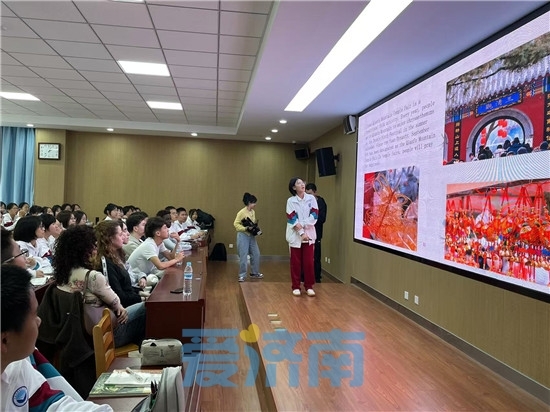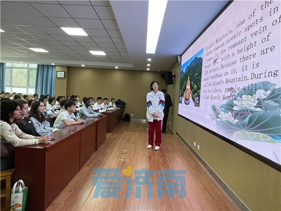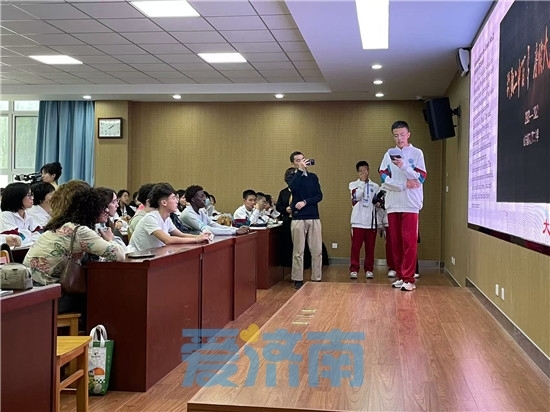 下午上课时间到,法国高中生分组来到济南二中班级教室,体验中国课堂,二中学子精心准备了英语演讲,为法国客人讲解关于济南的中华优秀传统文化。
