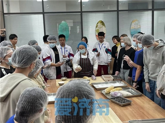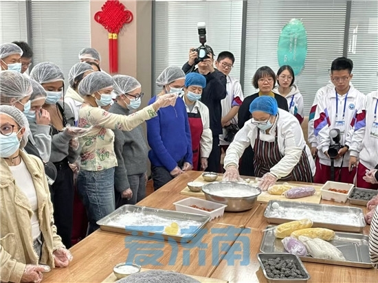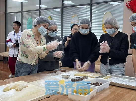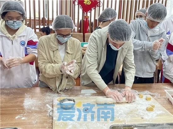 享用了美味的午餐,济南二中餐厅师傅拿出准备好的食材,手把手教法国师生做中国传统美食元宵和月饼。法国师生戴上头套、口罩和手套,认真听师傅讲解。