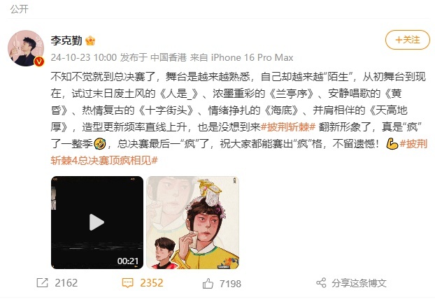 10月23日,歌手李克勤更新社交媒体,回顾本次在《披荆斩棘的哥哥》舞台上的演出,并为大家送上祝福: