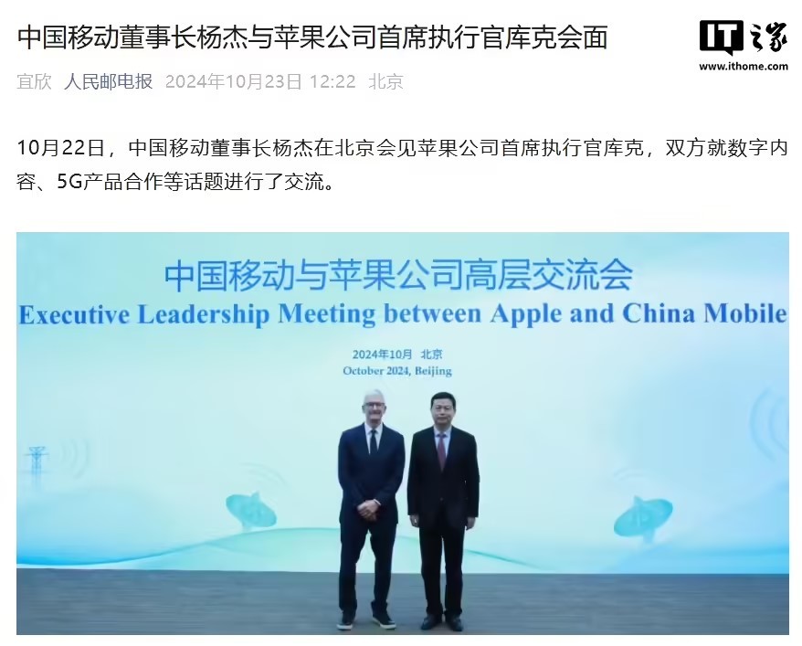 IT之家 10 月 23 日消息,据人民邮电报报道,10 月 22 日,中国移动董事长杨杰在北京会见苹果公司首席执行官库克,双方就数字内容、5G 产品合作等话题进行了交流。