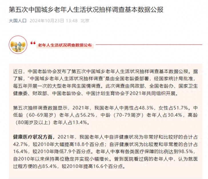 第五次抽样调查数据显示,2021年,我国老年人中男性占48.3%,女性占51.7%。中低龄(60-69周岁)老年人占56.2%,中龄(70-79周岁)老年人占30.4%,高龄(80周岁及以上)老年人占13.4%。