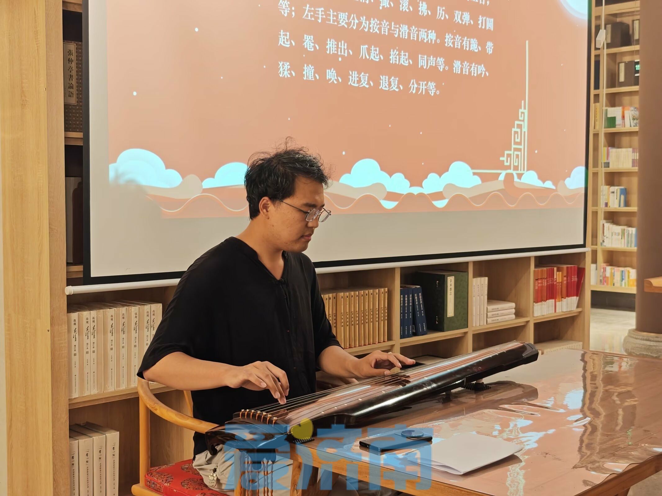 大家对古琴的历史有一定的了解后,俱乐部特邀的古琴老师陈明铄详细介绍了古琴的基本指法,并示范弹奏入门曲目《沧海一声笑》。
