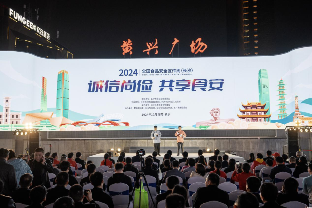 10月21日晚 , 以“诚信尚俭 共享食安”为主题的2024年全国食品安全宣传周(长沙)主场活动在黄兴广场举行 。 这场充满创意的活动 旨在 提升市民食品安全意识 , 通过有奖问答、食品安全脱口秀 等形式多样的活动内容 , 将食品安全小知识 传授给消费者 。