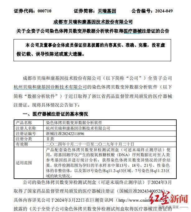 微成都报道 23日晚间,贝瑞基因(000710.SZ)公告称,公司全资子公司杭州贝瑞和康基因诊断技术有限公司的染色体拷贝数变异数据分析软件(以下简称“数据分析软件”)于近日取得了浙江省药品监督管理局颁发的医疗器械注册证。